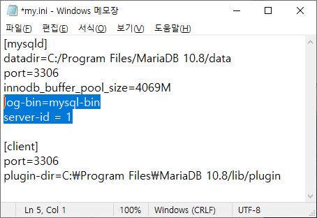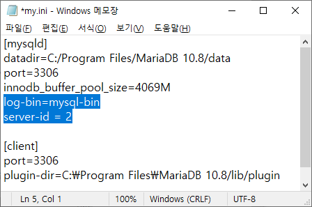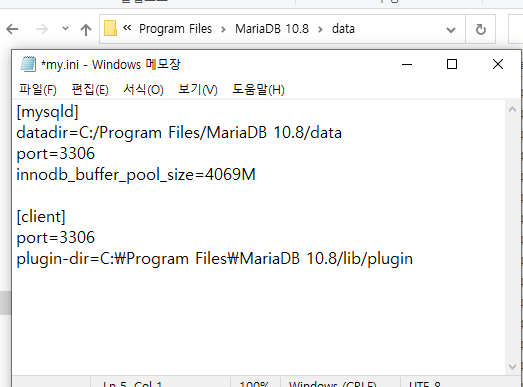 3. MariaDB가 설치된 경로로 이동하여 my.ini 파일을 메모장으로 실행합니다.
