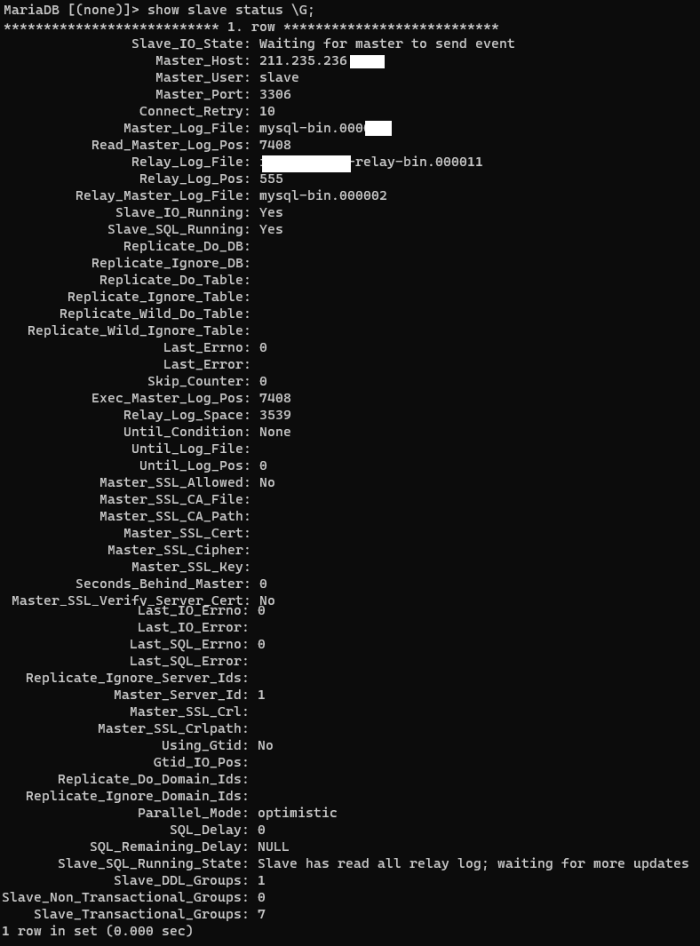 해당 쿼리를 실행하여 master 서버의 설정 상태가 정상으로 확인된다면 완료입니다.