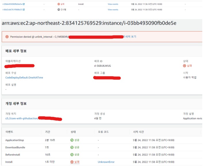 위는 기존 IIS 사이트 중지, 점유 프로세스 종료 대신 140초 정도의 딜레이를 준 뒤, 배포가 되게 했을 때의 codedeploy 인스턴스 화면입니다. 프로세스가 종료되지않아 test.dll이 프로세스에서 점유하고있어, 덮어쓰기가 거부된 에러 메세지를 확인할 수 있습니다.