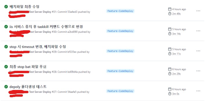 위 설정파일을 만들었다면, 이제 feature-CodeDeploy브랜치에 push만 하면 레포지토리의 action 탭에서 진행상황을 아래처럼 확인하실 수 있습니다.