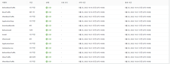 - hooks <한 인스턴스 CodeDeploy 진행 상황>에서 확인할수 있는 진행 상황에서 실행될 hook들입니다.