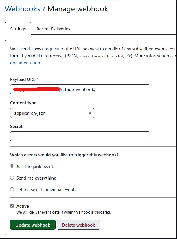 프로젝트 github 레포지토리 생성 및 푸시 후 settings > Webhooks