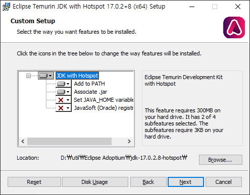 설치 위치와 환경 변수 설정을 결정합니다. 설치위치만 변경하고, 환경변수는 기본 설정 그대로 사용했습니다. 현재 제 컴퓨터에는 여러 버전의 JDK가 설치되어 있어서 JAVA_HOME등의 환경 변수는 필요에 따라 수동으로 설정 하는게 좋습니다(사실 요즘 IDE들은 자체적으로 설정을 가지게 되므로 환경변수 설정이 필요한 경우가 별로 없었습니다).