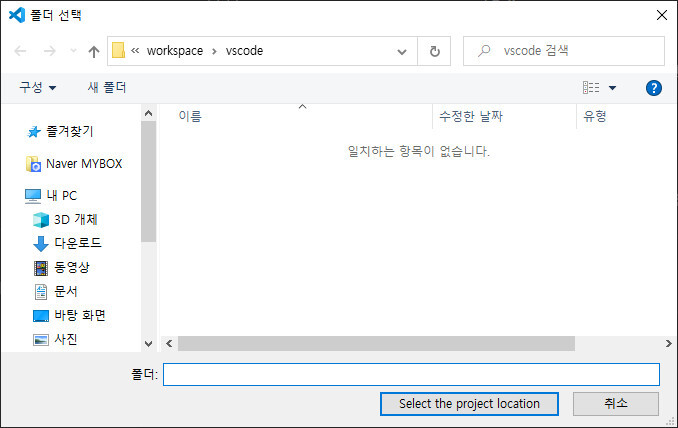 프로젝트 타입을 선택하면 프로젝트 파일들이 저장될 폴더를 선택해야 합니다. 앞에서 만든 vscode 폴더를 선택합니다.