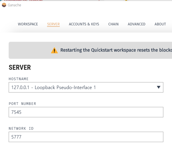 | networks: { development: { host: "127.0.0.1", // Localhost (default: none) port: 7545, // Standard Ethereum port (default: none) network_id: "5777", // Any network (default: none) }, |